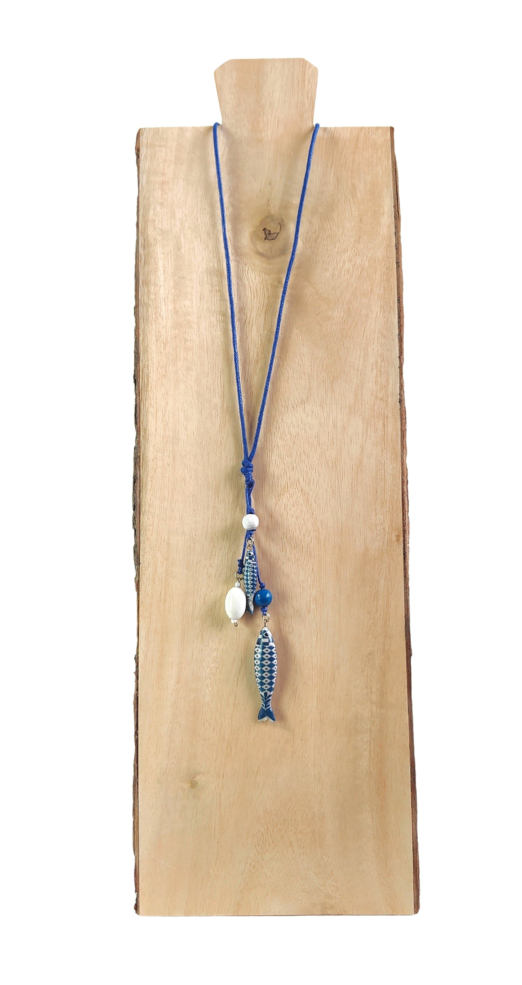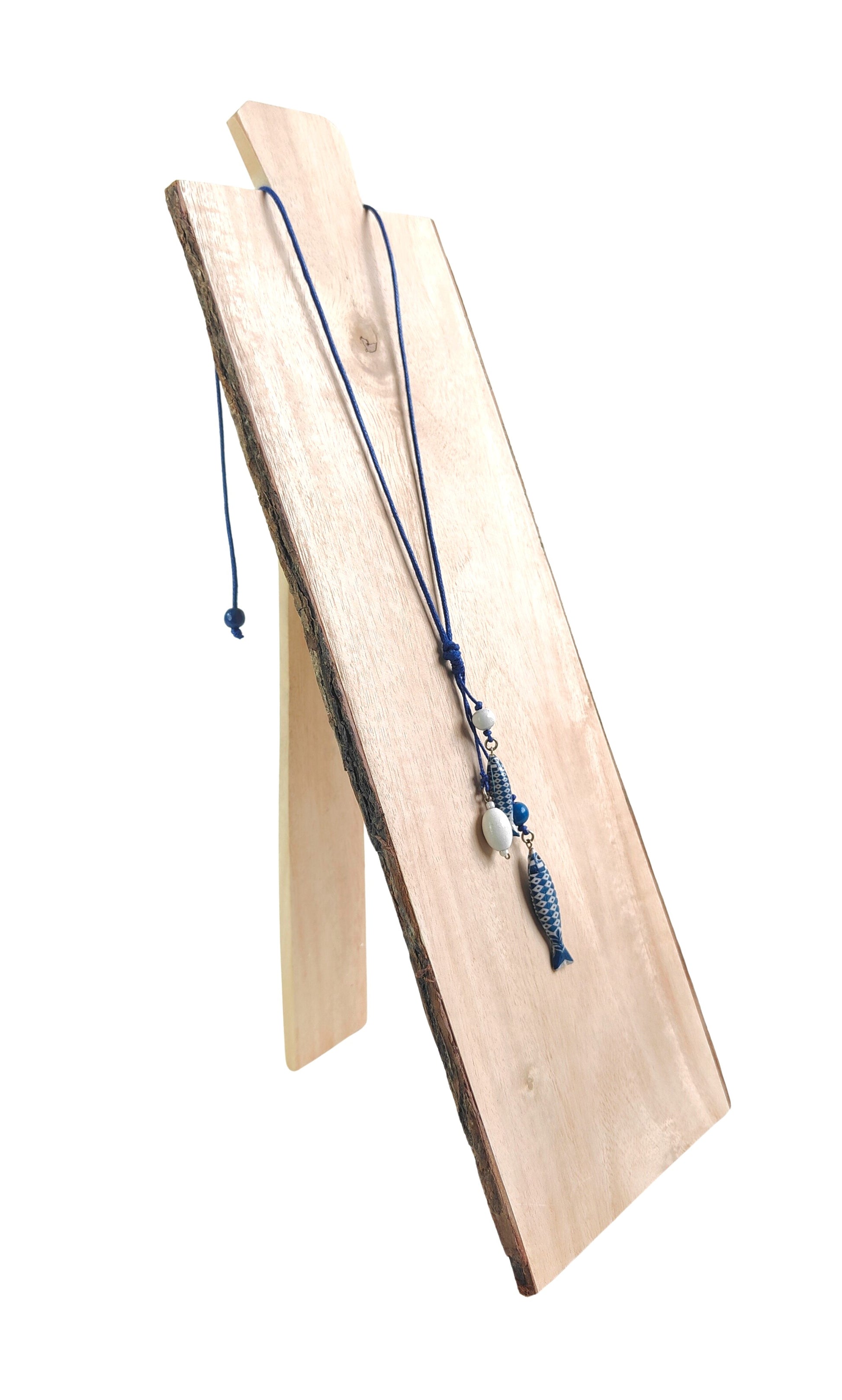 Colgante artesanal con dos peces de tamaños distintos elaborados mediante técnica de decoupage. Complementado con dos pequeñas piezas de madera pintadas a mano que añaden textura y carácter único a la pieza. Cordón ajustable de algodón puro que se adapta a cualquier cuello. Cada colgante es una creación única, perfecta para quienes buscan accesorios con personalidad y elaboración cuidadosa. Ideal como regalo especial o para completar tu estilo bohemio.