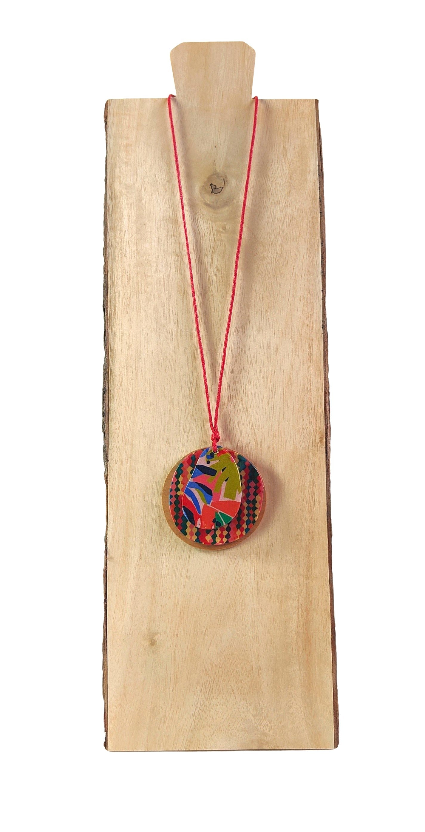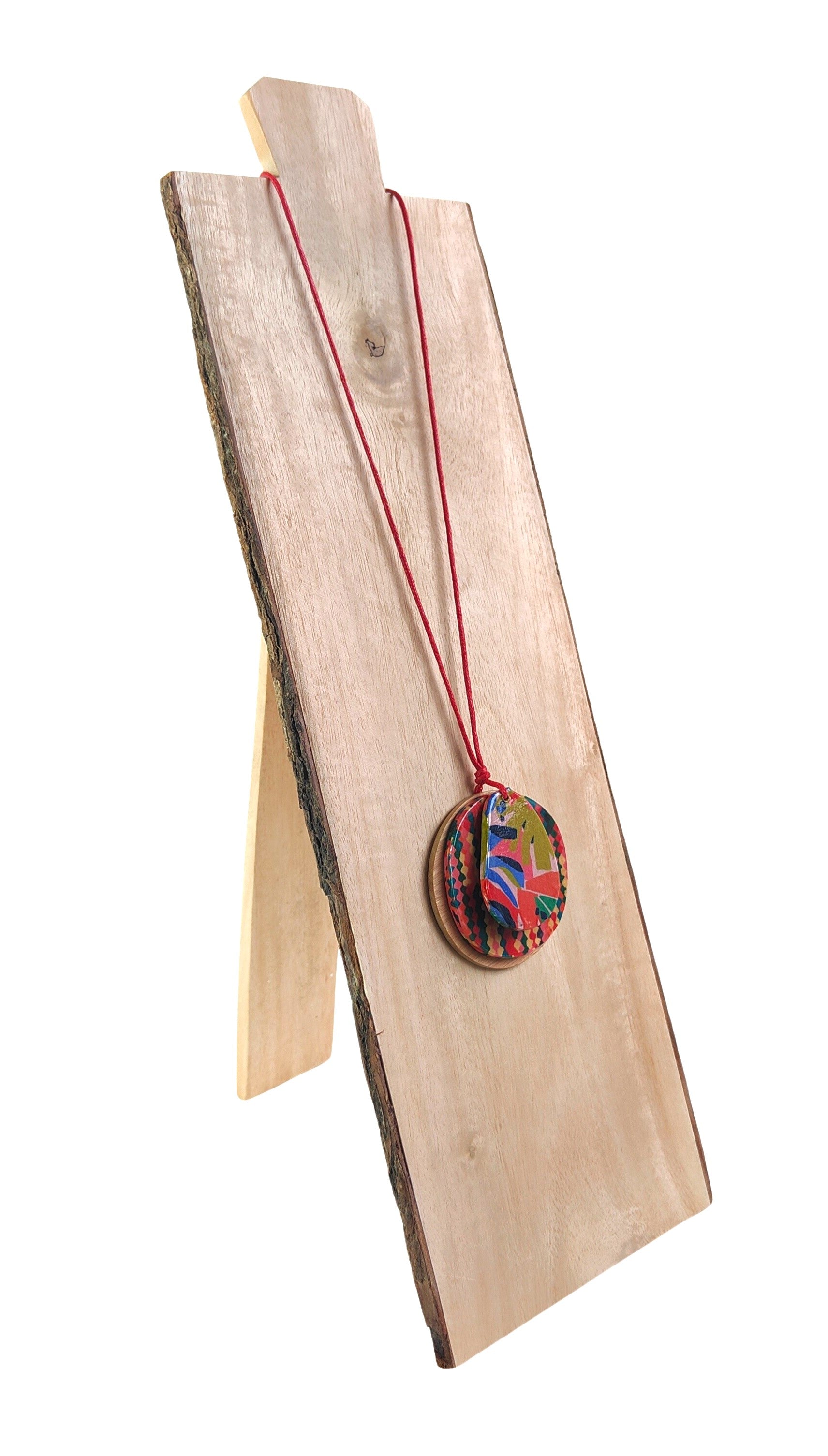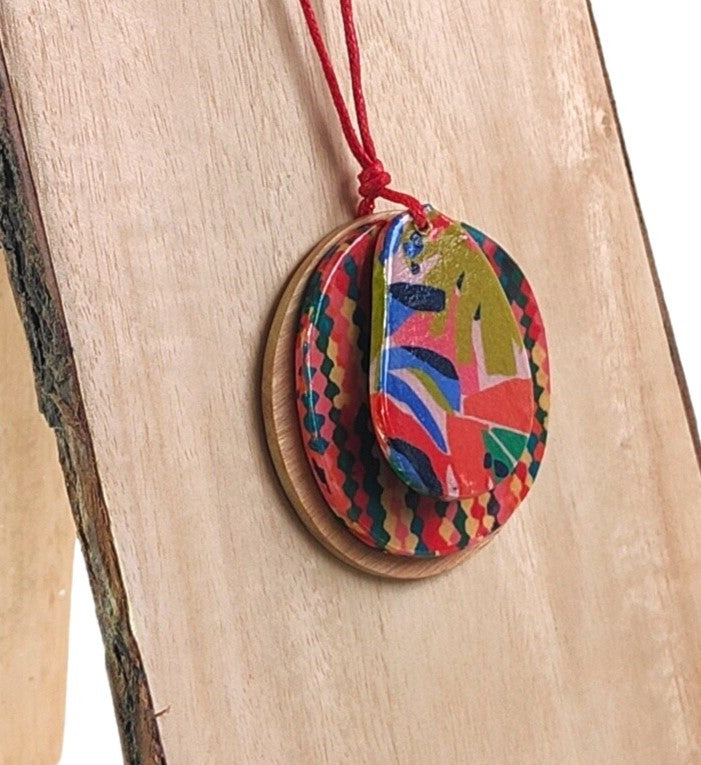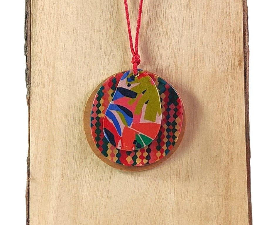 Colgante artesanal con tres piezas de madera superpuestas en formas variadas, decoradas con la técnica de decoupage que aporta detalles únicos a cada pieza. Cordón de algodón ajustable que permite personalizar el largo según tus preferencias. Un accesorio versátil que combina naturaleza y creatividad, perfecto para quienes buscan piezas originales y sostenibles con carácter bohemio.