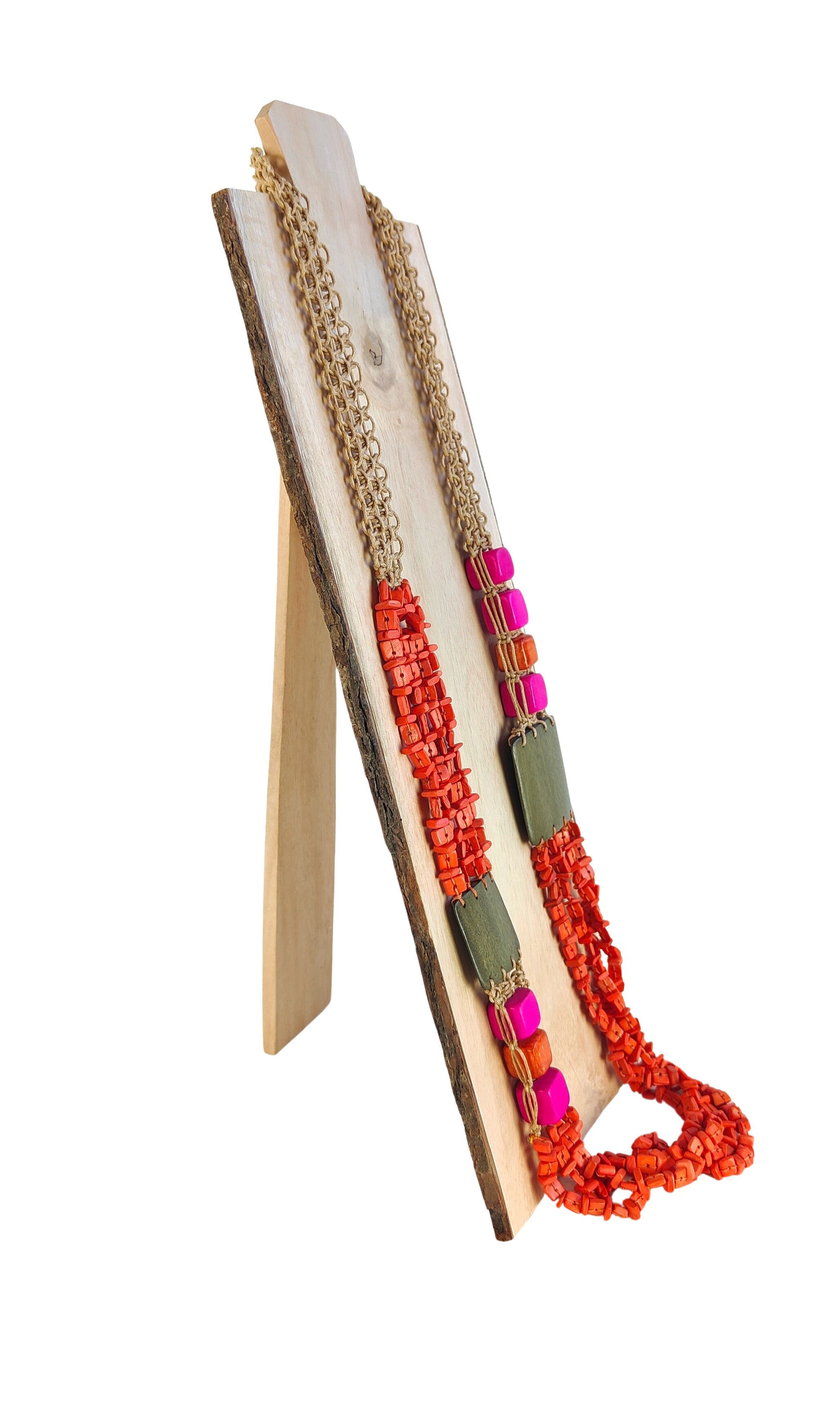 NECKLACE WITH PAINTED WOOD PIECES, GLAZED MOTHER-OF-PEARL PIECES AND NATURAL ROPES.