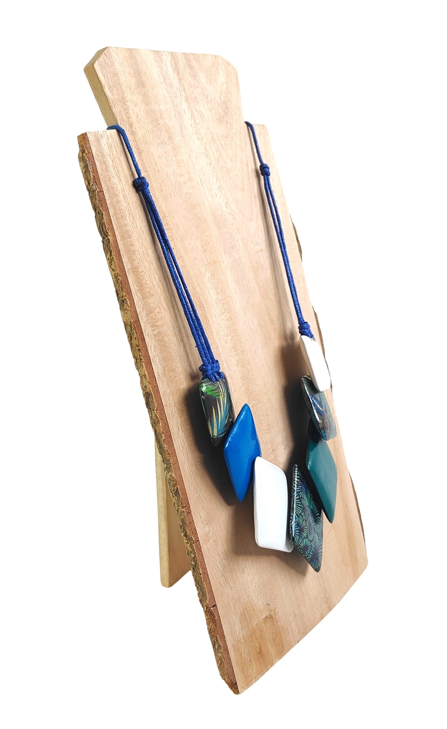 Collar artesanal compuesto por siete cuadrados dispuestos de forma irregular. Tres piezas elaboradas con técnica de decoupage sobre madera ligera, combinadas con elementos pintados a mano que aportan singularidad a cada pieza. Cordón ajustable de algodón que permite un ajuste cómodo y personalizado. Una joya única que fusiona técnicas tradicionales con un diseño contemporáneo y versátil.