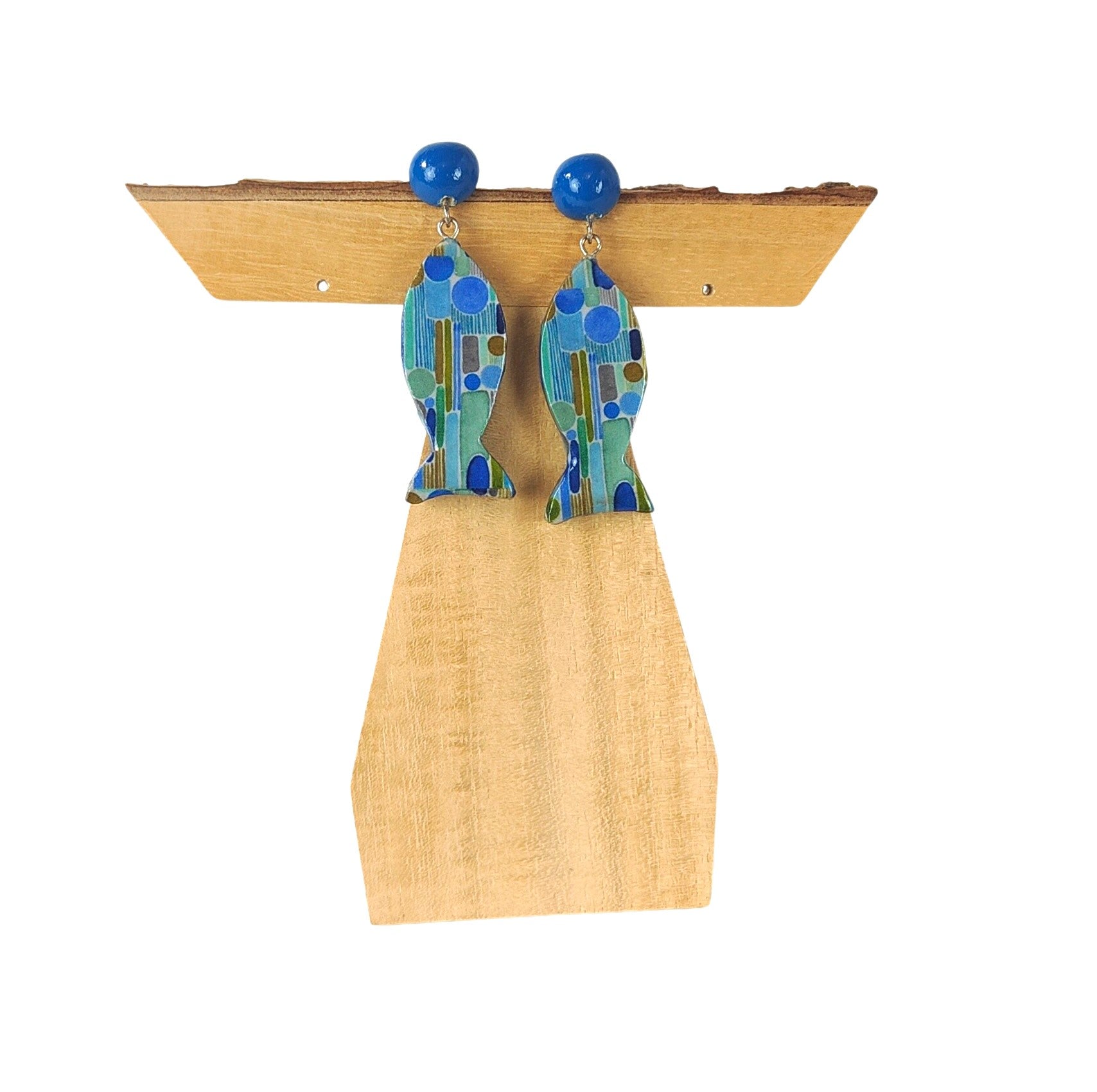 Pendiente artesanal con forma de pez elaborado mediante la técnica decoupage sobre madera ligera. Este accesorio combina diseño delicado con un acabado detallado, perfecto para quienes buscan joyería única y ecológica. Su peso mínimo garantiza comodidad durante todo el día, mientras que la técnica manual le confiere un carácter especial. Ideal para complementar cualquier estilo con un toque natural y original.