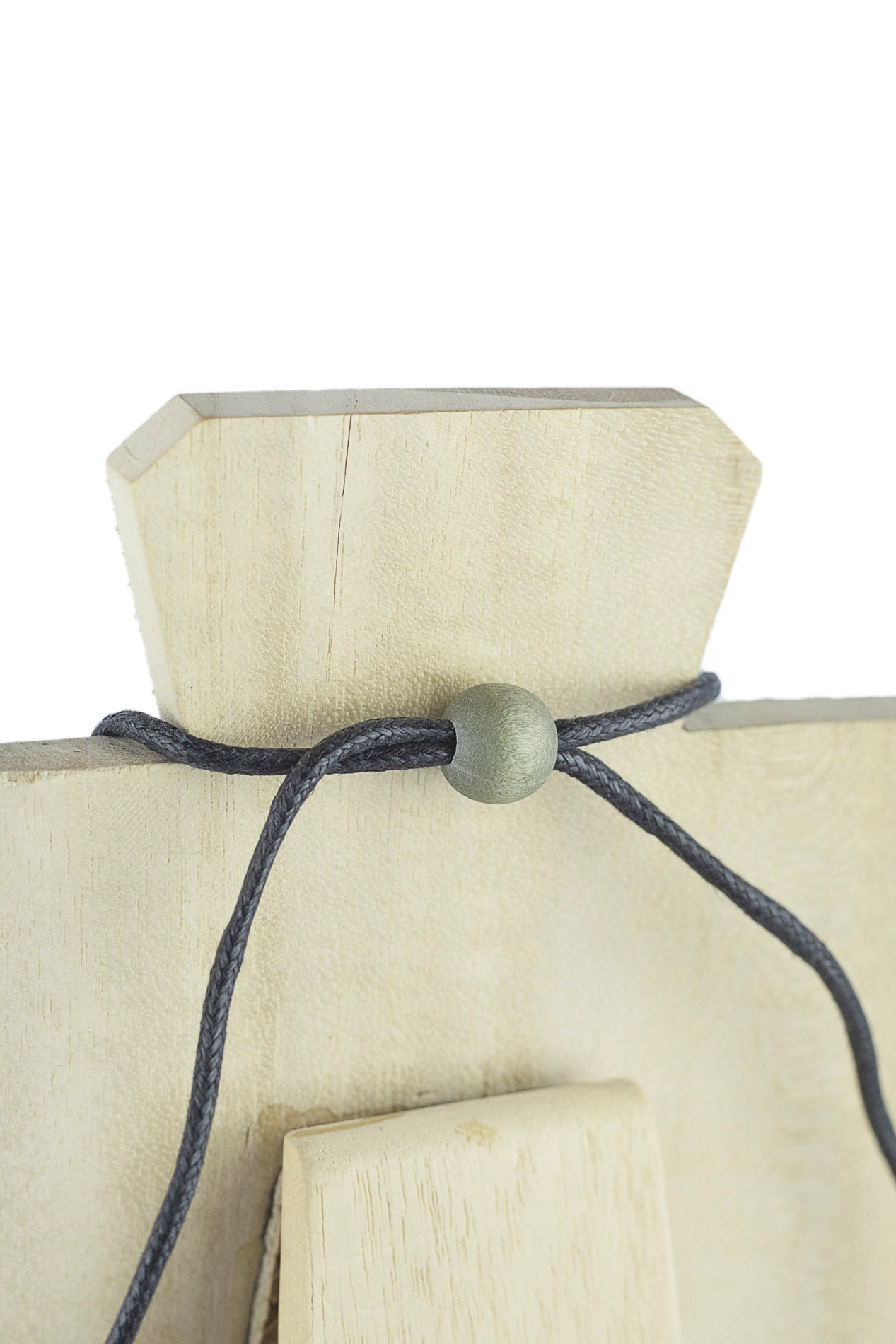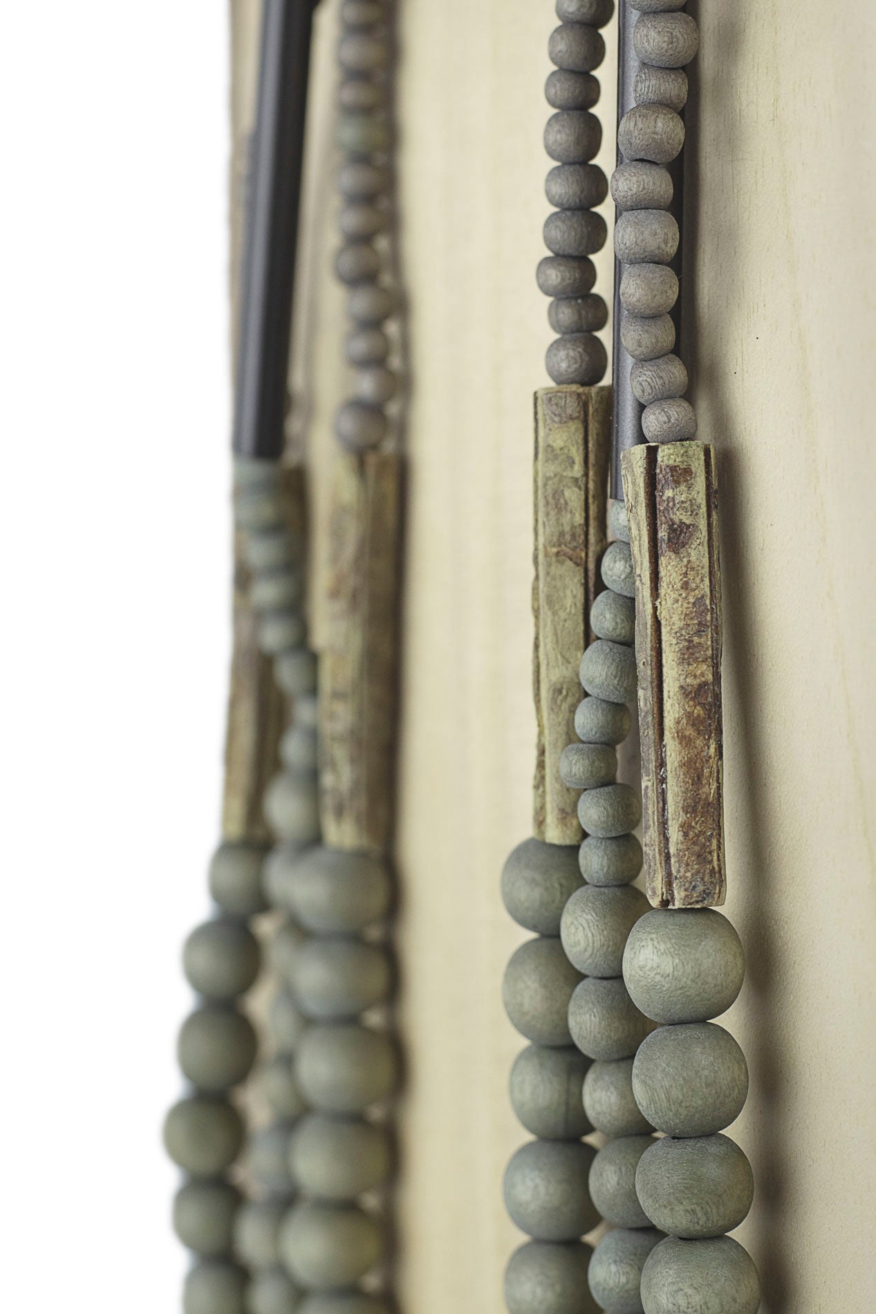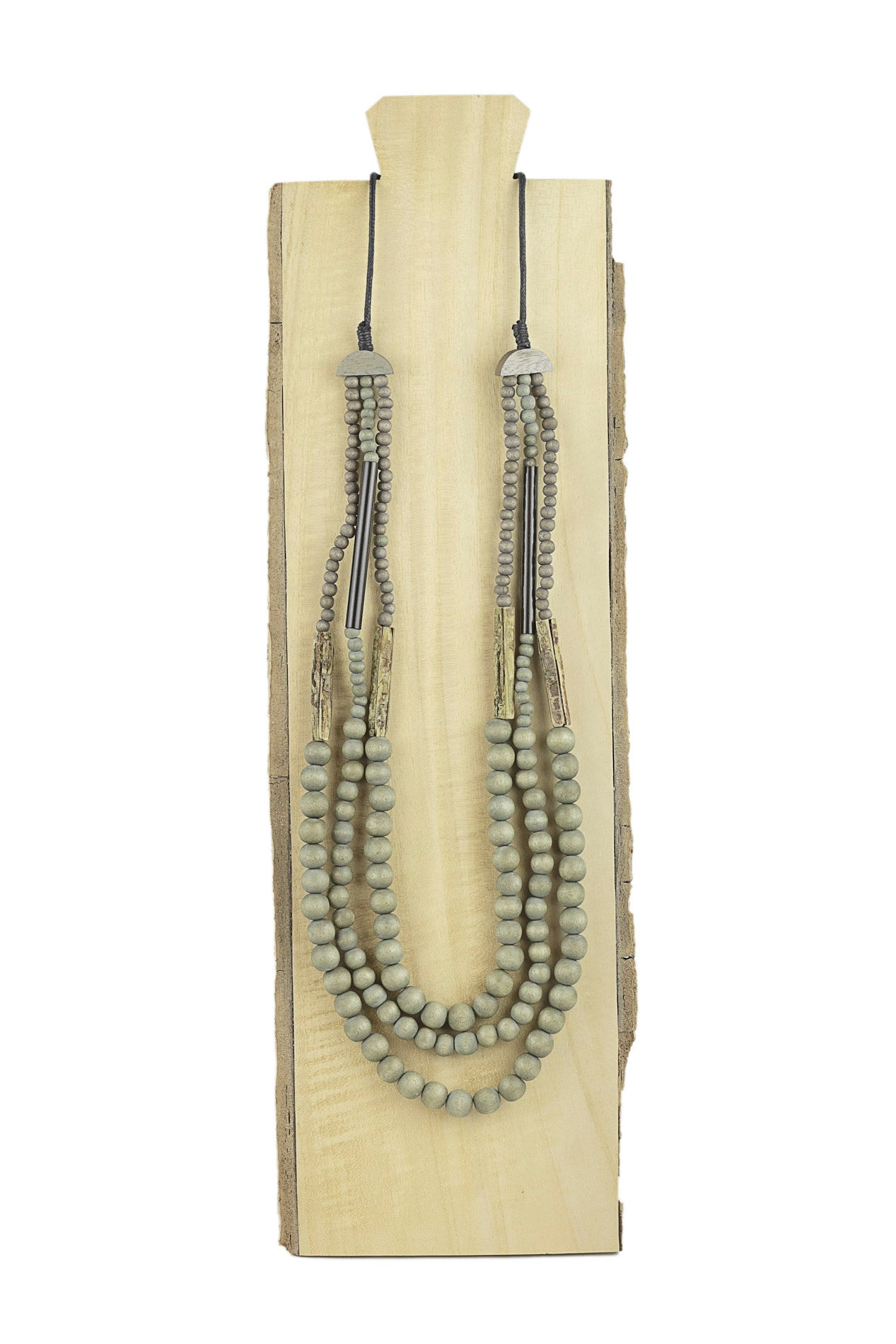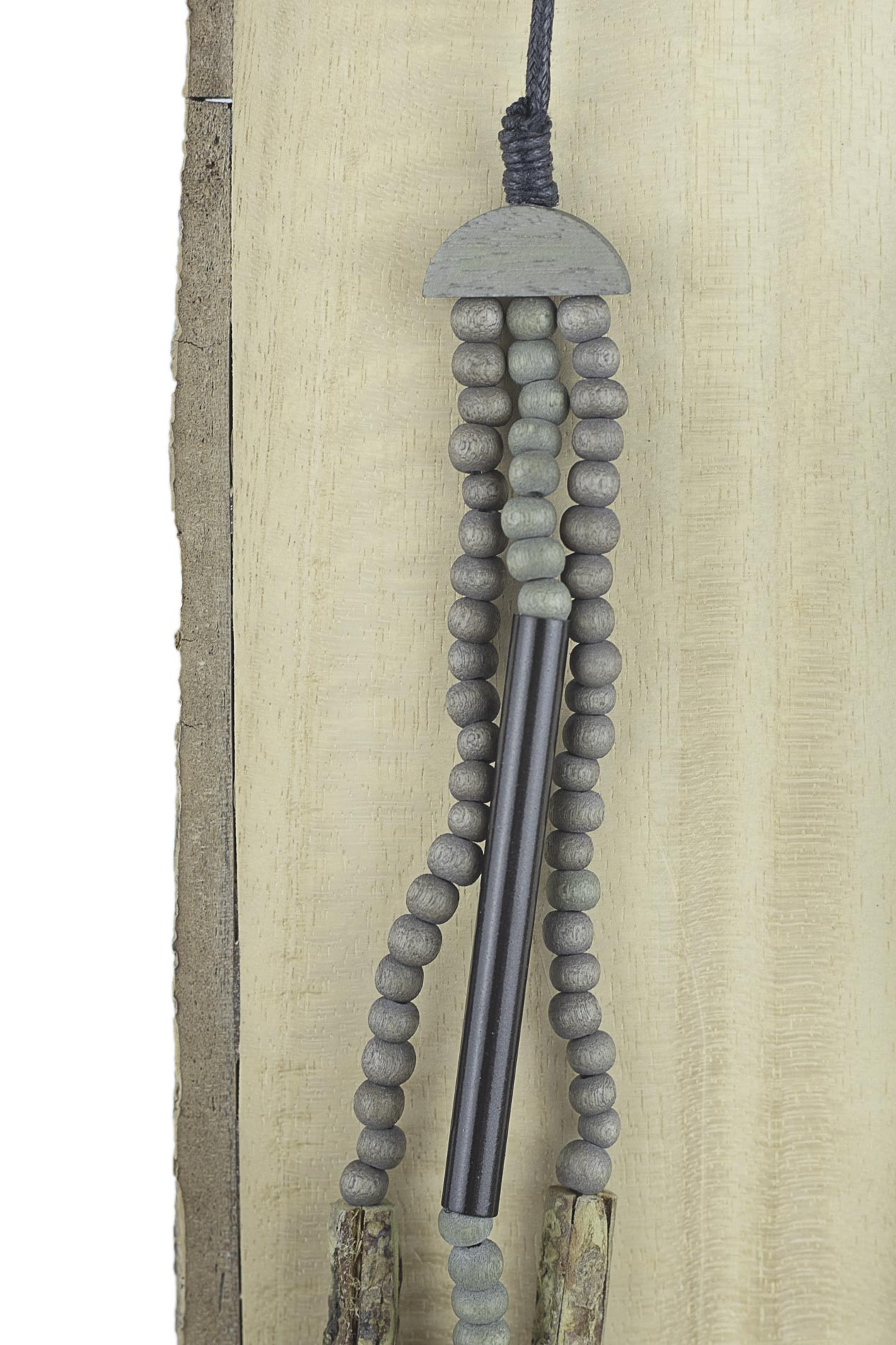 Collana realizzata con pezzi di legno tinti in colori opachi e con dettagli in alluminio.