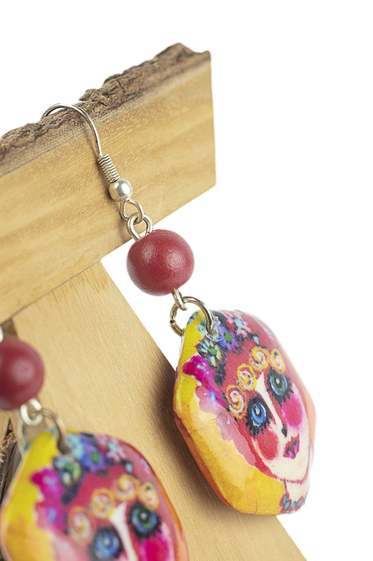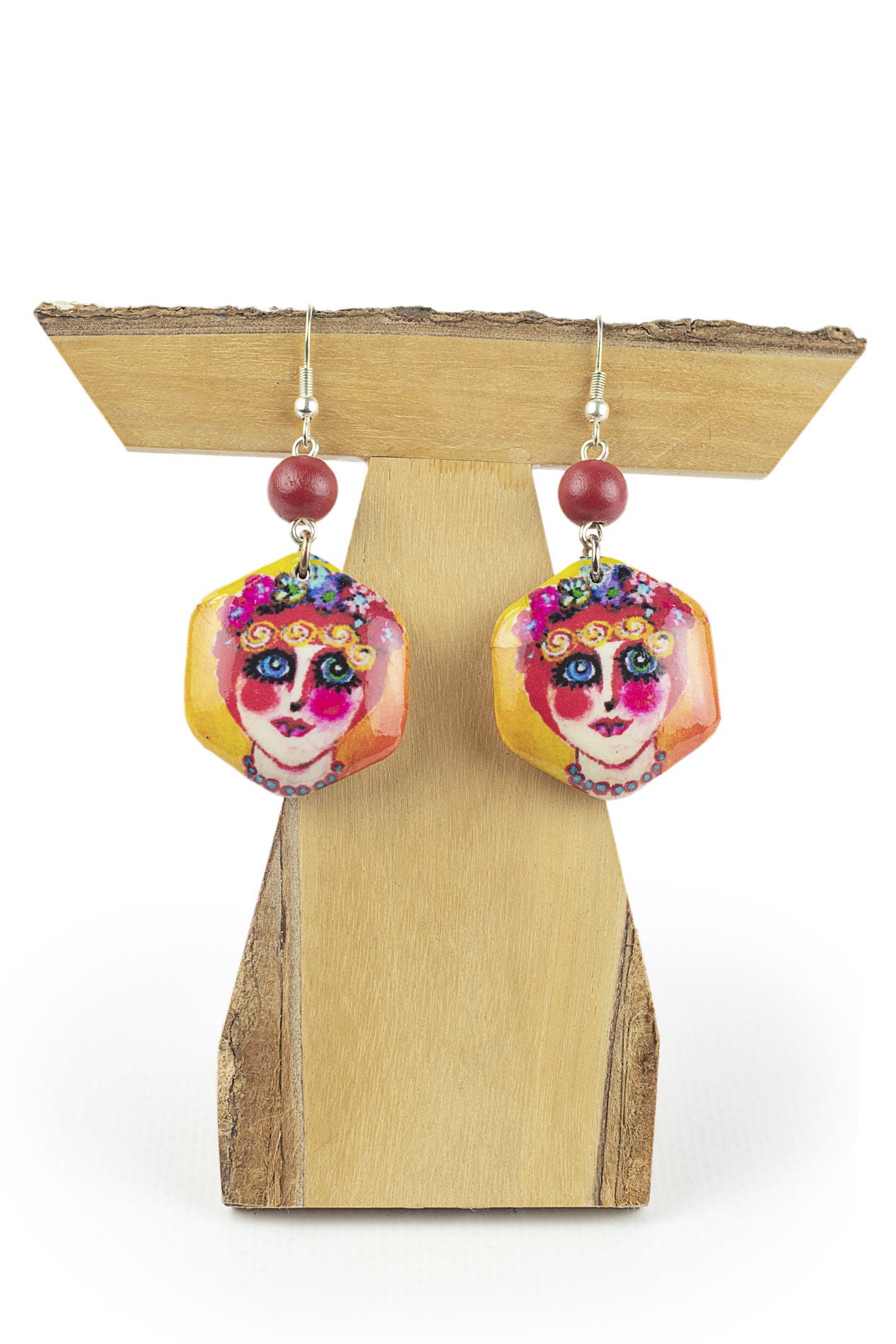 Orecchino con pezzo esagonale, realizzato con la tecnica del decoupage (carta molto sottile incollata su legno e con uno strato esterno di resina trasparente), multicolore con un'opera del pittore Oranudee Suvanban. Semplice, originale, ecologico. Con gancio ipoallergenico.