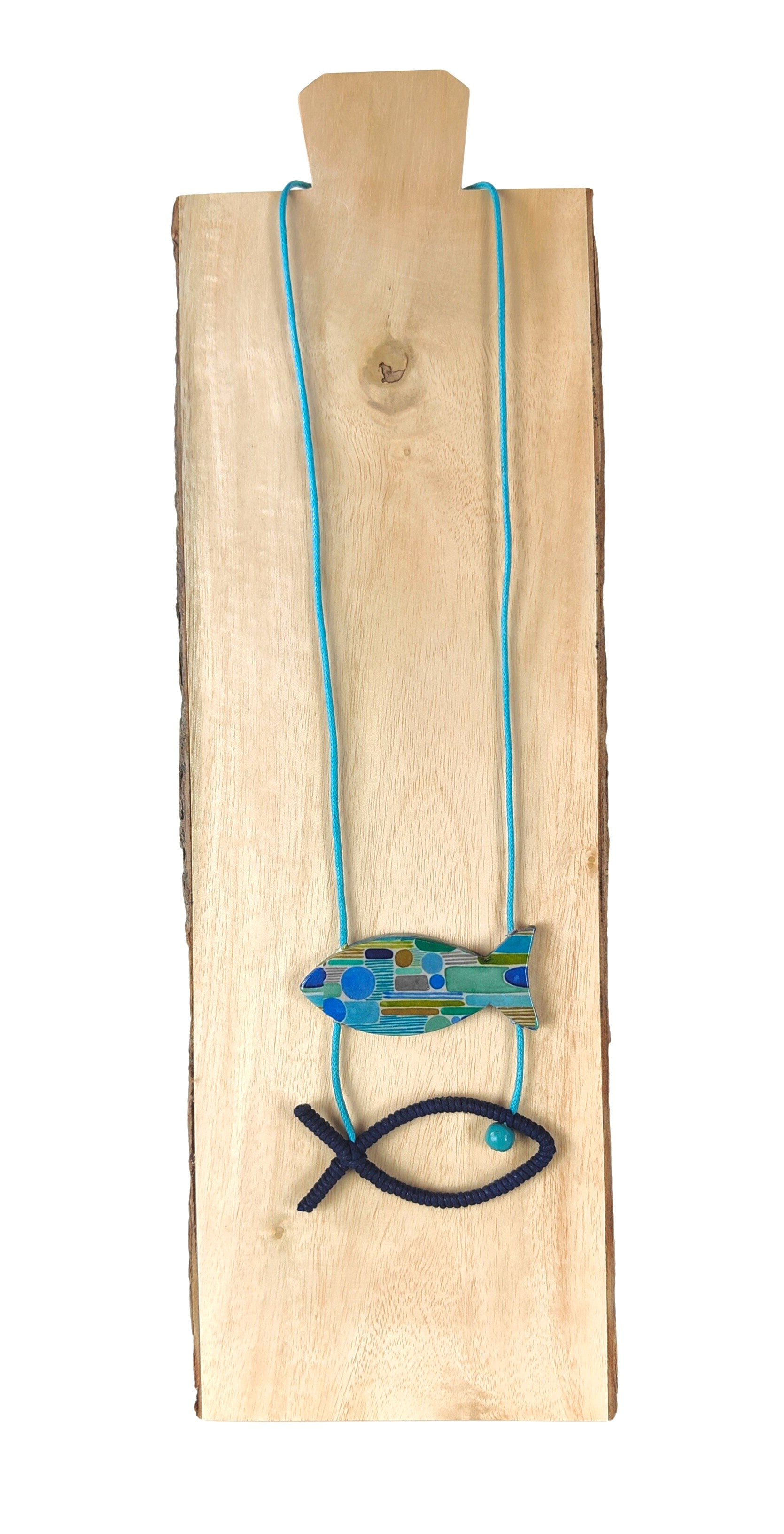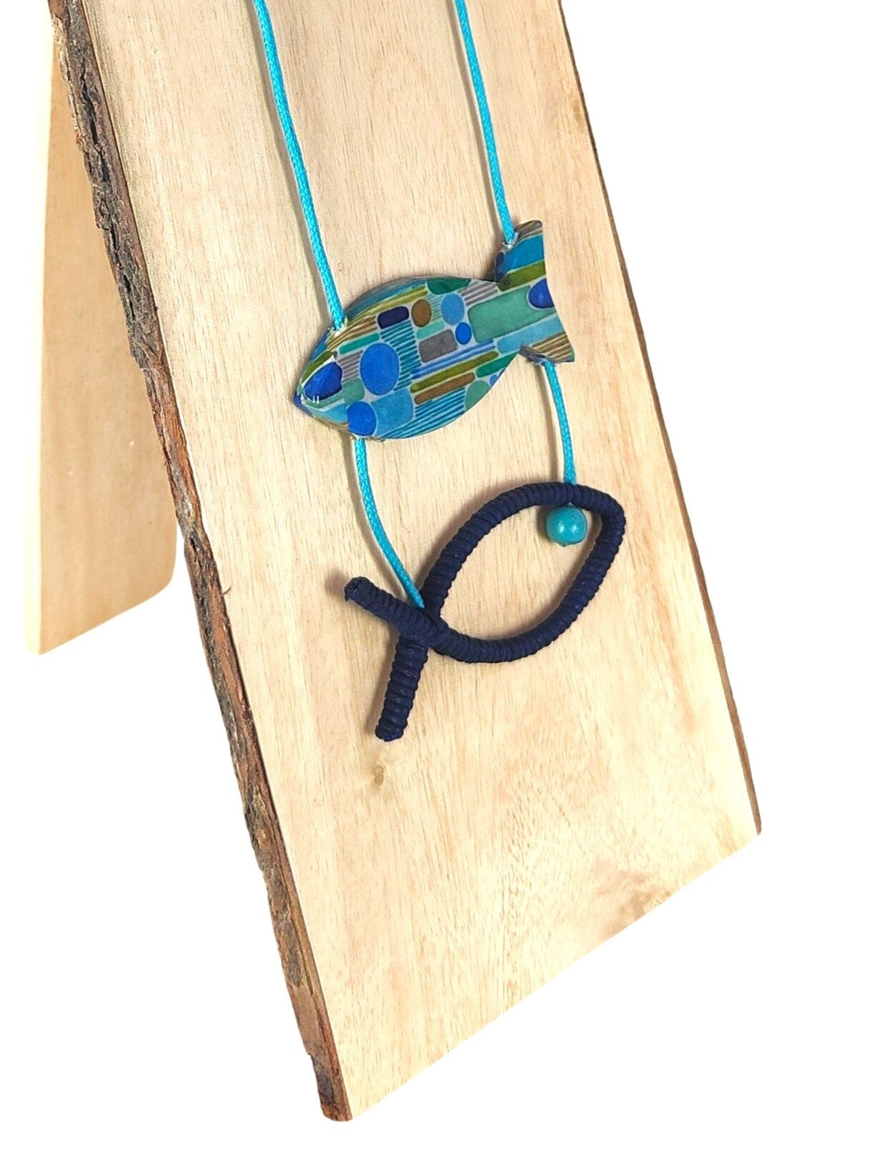 Colgante artesanal que combina dos técnicas creativas: un pez elaborado con decoupage y otro formado por una delicada silueta de alambre e hilo de algodón, con una pequeña esfera que simula el ojo. Cordón de algodón ajustable que se adapta a cualquier cuello. Una pieza única que fusiona arte y naturaleza, perfecta para quienes aprecian los accesorios hechos a mano con detalle y originalidad.