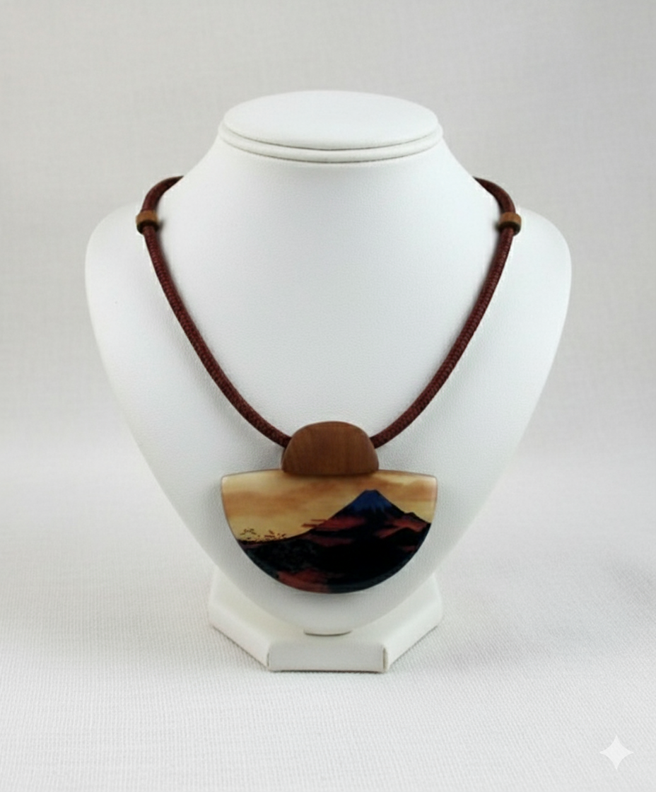 Este colgante ajustable combina elegantemente madera y resina, realzado con imágenes icónicas de los maestros Hiroshige, Hokusai y Zeshin. Su diseño refinado ofrece versatilidad y un toque de arte japonés tradicional, ideal para quienes aprecian la fusión entre naturaleza y cultura en una pieza única y sofisticada.