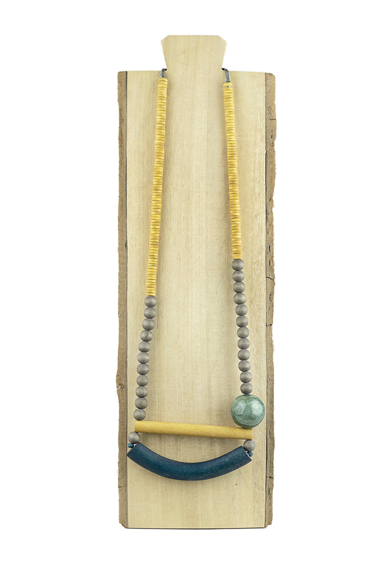 Este collar combina diseño moderno y materiales responsables. Elaborado con cuentas de madera sostenible, incluye una esfera pintada a mano con acabado estilo capiz que aporta un efecto nacarado único. Sus formas geométricas y colores contrastantes lo convierten en una pieza llamativa y versátil. Y su asimetría le da la particularidad que hace que un diseño llame tanto la atención.