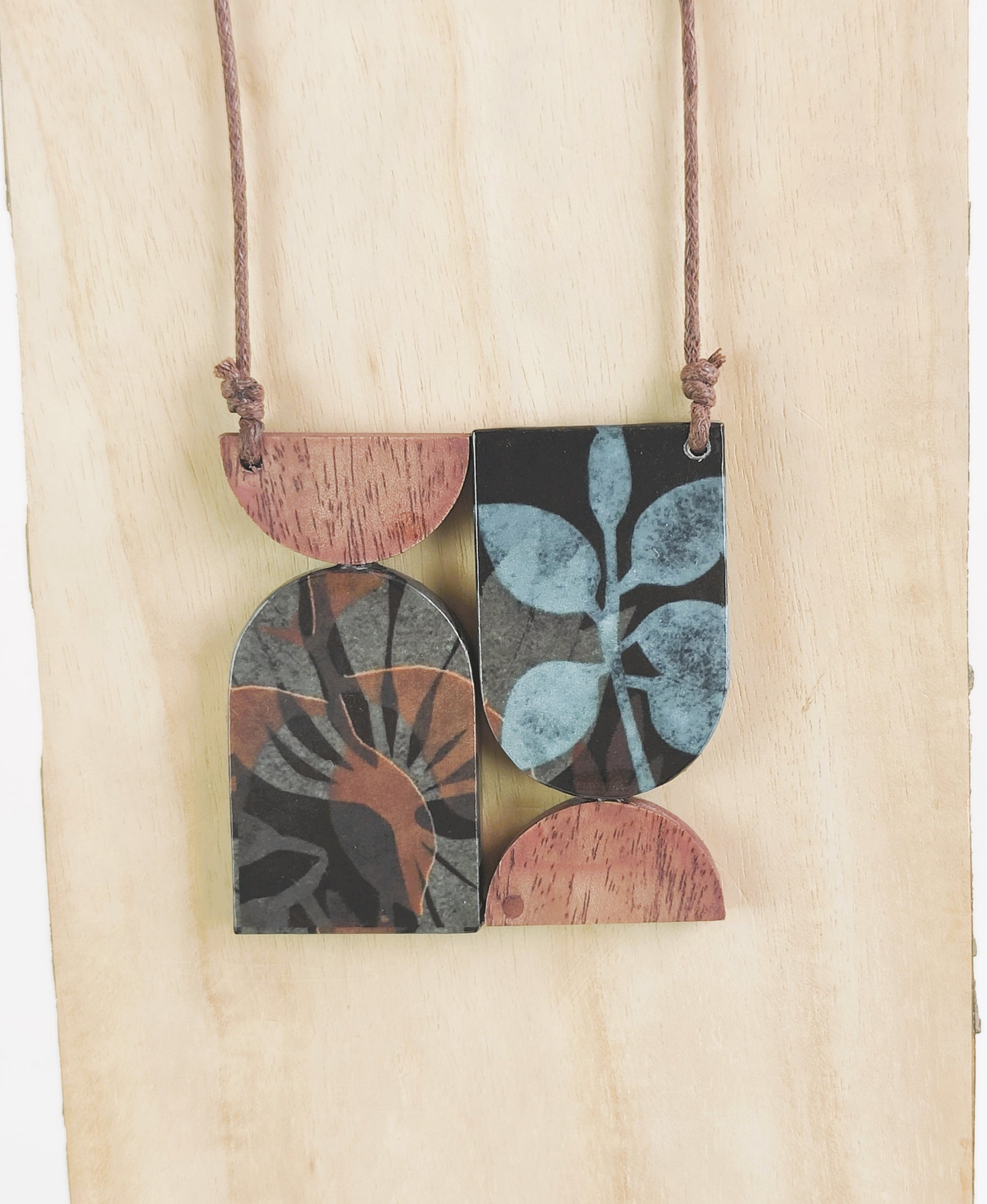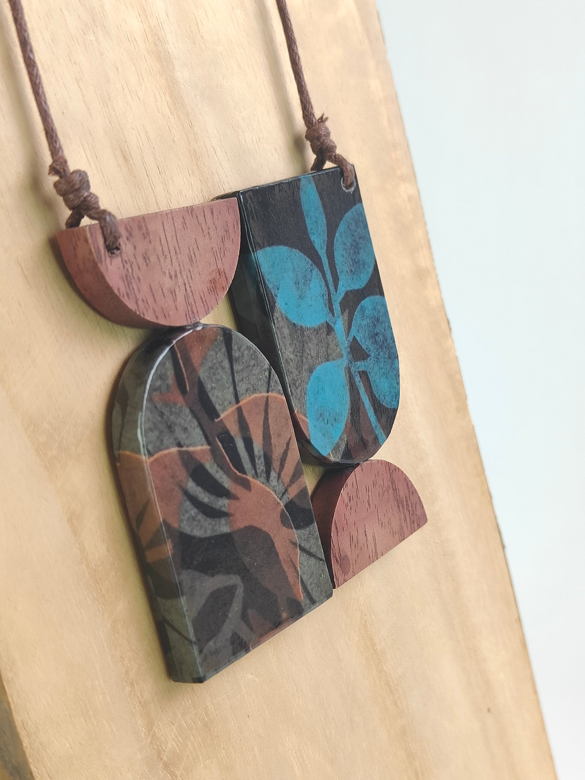 Este colgante de cuatro piezas destaca por su diseño original y delicado, elaborado con técnica de decoupage que le aporta un toque artístico único. Su cordón de algodón regulable garantiza un ajuste cómodo y personalizado, ideal para complementar cualquier look con elegancia y distinción.
