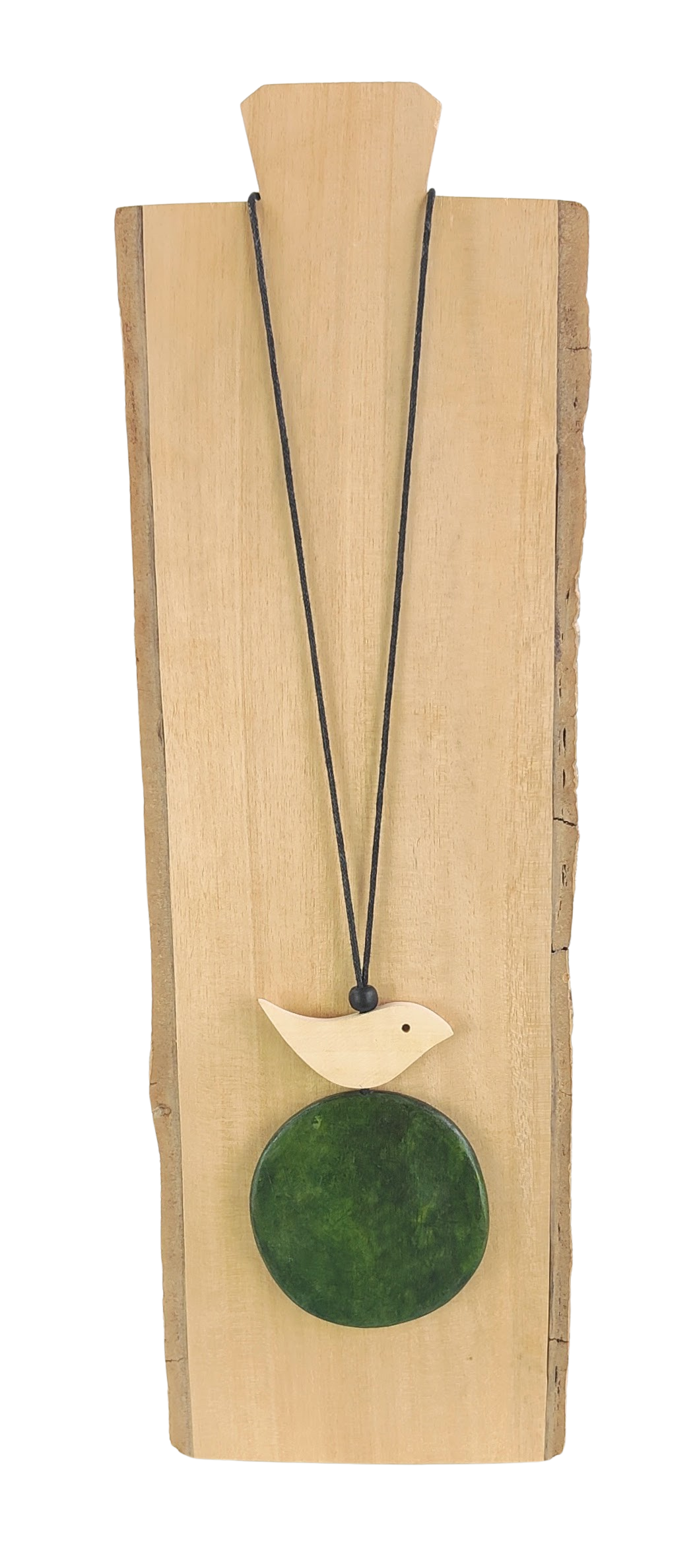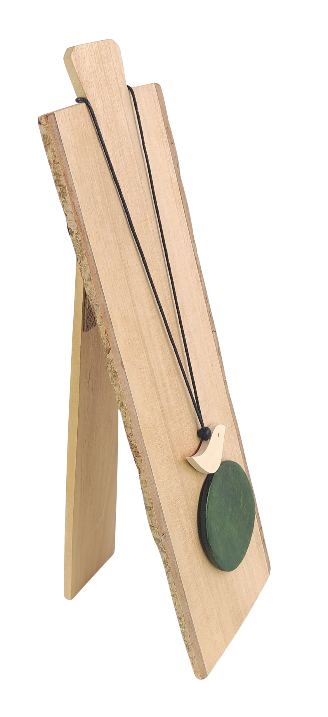 Este colgante atrevido combina dos piezas únicas de madera: una circular y otra con la forma audaz de un pájaro. Su cordón de algodón ajustable permite adaptarlo a tu estilo y altura, aportando un toque original y natural. Perfecto para quienes buscan una pieza que destaque con personalidad y autenticidad.