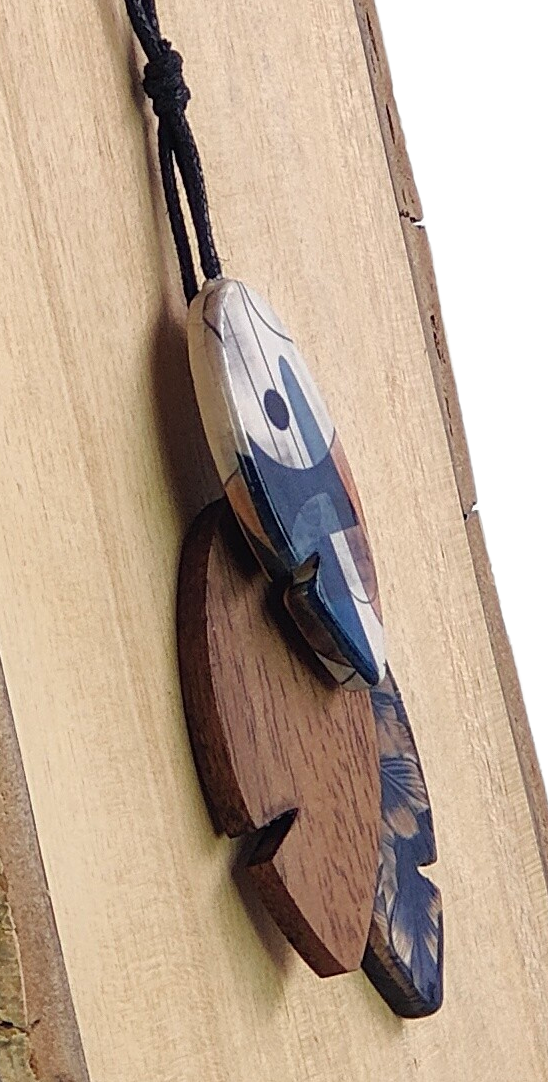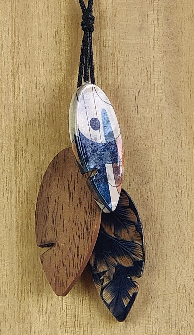 Descubre la elegancia natural con este colgante formado por tres hojas. Dos de ellas están decoradas con la delicada técnica de decoupage sobre madera, aportando un diseño artístico y único, mientras que la tercera pieza resalta la belleza de la madera natural. Además, el cordón de algodón ajustable garantiza un ajuste cómodo y personalizado para cualquier ocasión. Un accesorio perfecto que combina arte y naturaleza para realzar tu estilo con sofisticación.