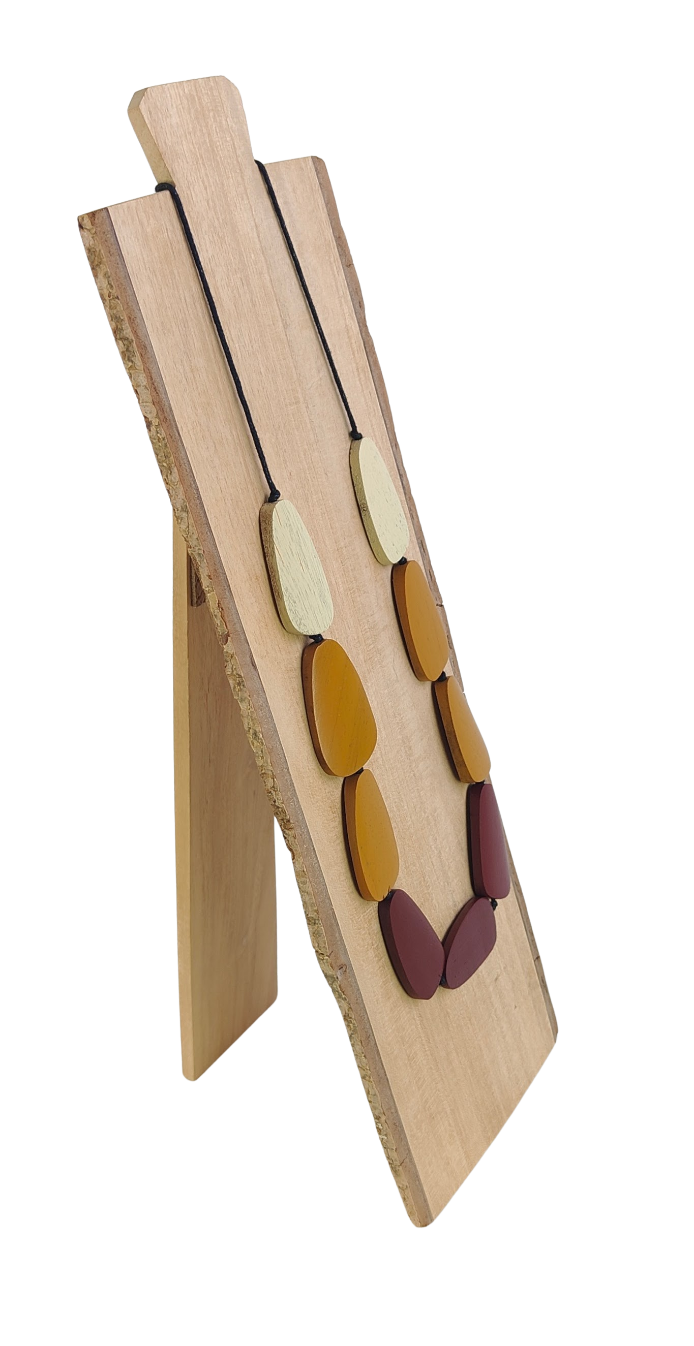 Este collar Pebbles combina la elegancia natural y el arte artesanal con formas orgánicas de madera pintada a mano, realzando su exclusividad. Su diseño complementa looks sofisticados, mientras el cordón de resina ajustable asegura un ajuste perfecto y cómodo. Una pieza única que aporta un toque de distinción y estilo refinado.