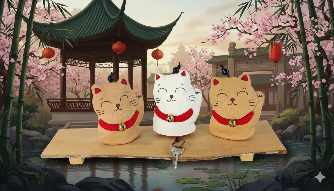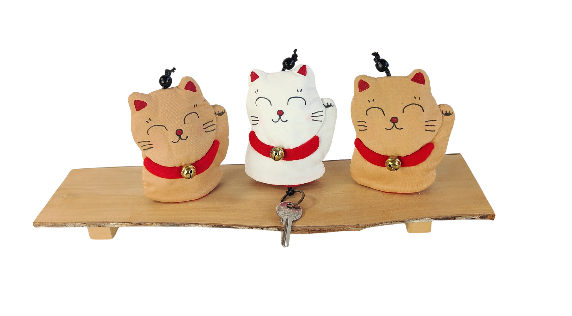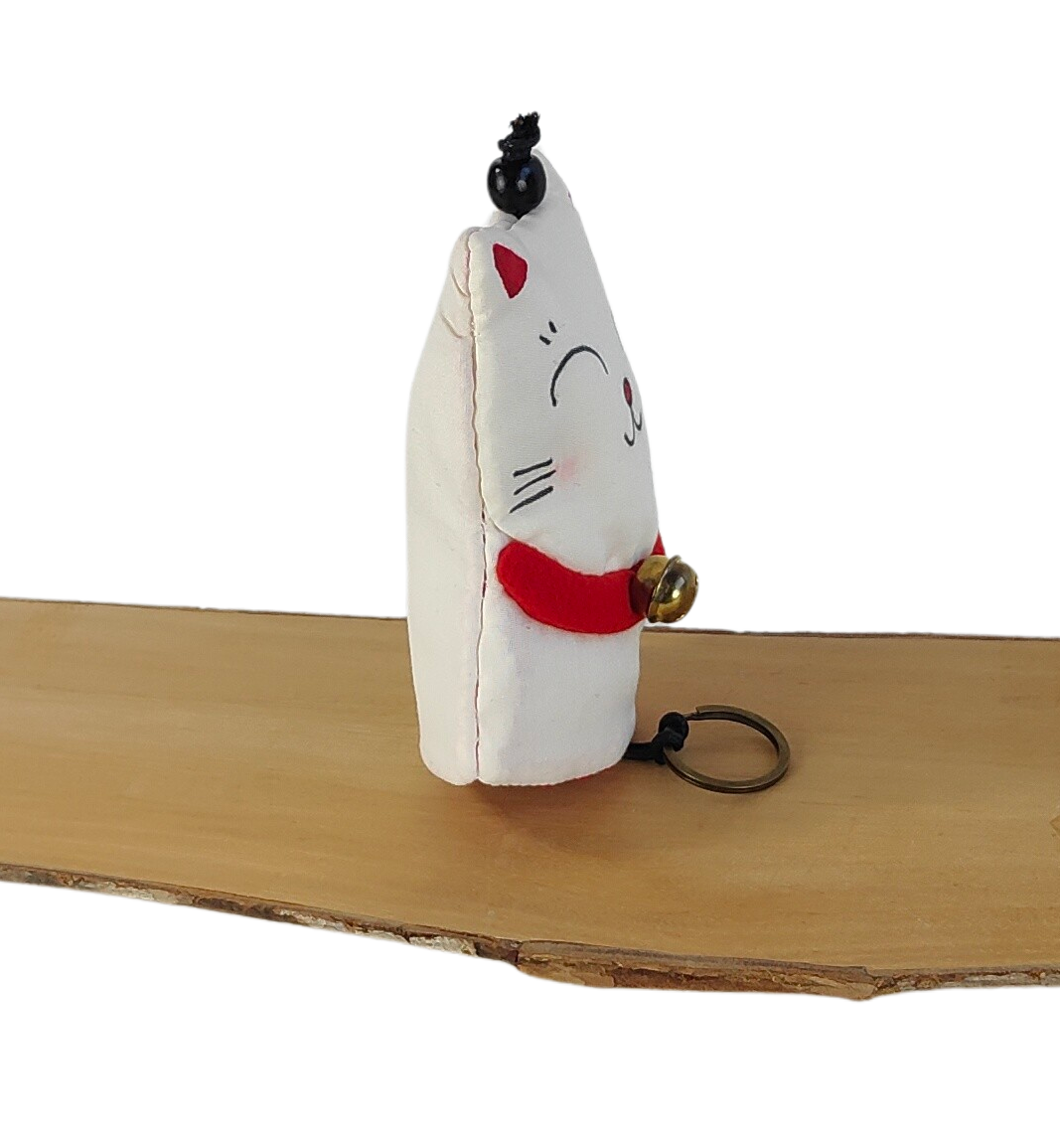 Este llavero con gato de la suerte combina diversión y protección: su tela forrada cuida tus llaves y objetos del bolso para que no se dañen, mientras que el encantador gatito chino y su cascabelito alegran tu día con cada movimiento. Un toque juguetón que no querrás perder.